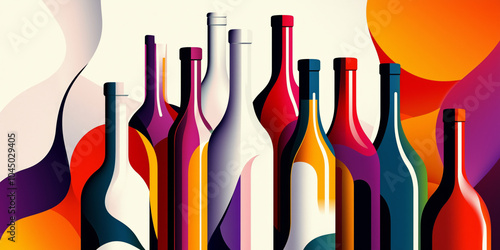 a minimalistic illustration depicting many wine bottles assembled together, a colored background