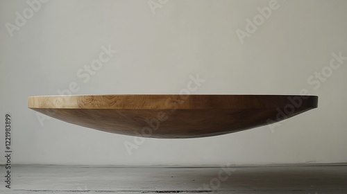 A minimalistic studio shot of a wooden bowl levitating above a wooden surface against a gray backdrop