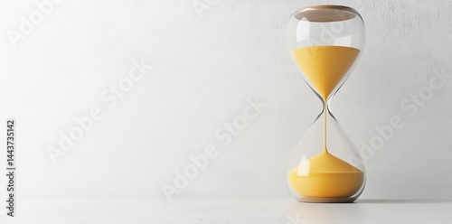 A minimalistic surface showcases an hourglass with intricately designed yellow sand, symbolizing time's passage in an artistic way