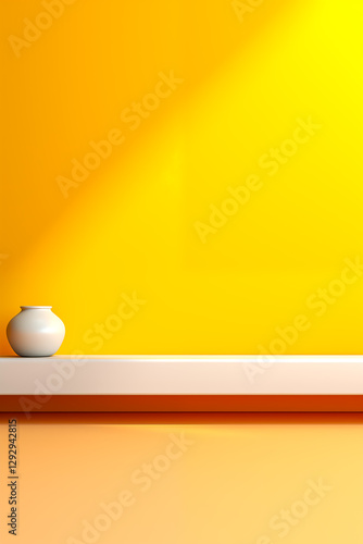 A minimalistic white vase on a shelf against a vibrant yellow wall creating a bright ambiance.
