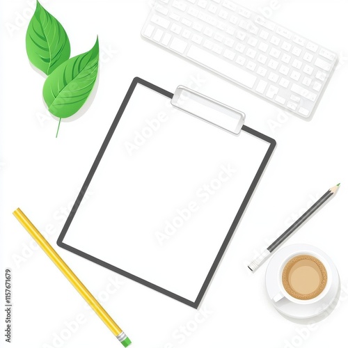 A minimalistic workspace featuring a clipboard, coffee cup, pencil, and leaves, ideal for creative projects.
