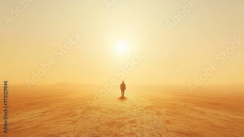 A mirage on the horizon in the middle of a hot, empty desert, with a lone traveler walking toward it in the distance.
