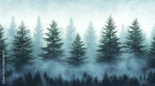 A misty forest landscape with tall evergreen trees and a serene atmosphere.