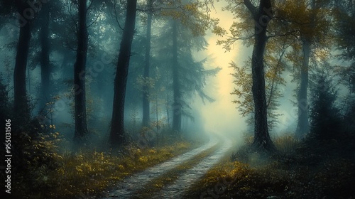 A misty forest path winds through tall trees, leading to a sunlit clearing.