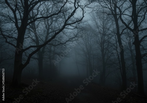A misty forest scene with silhouetted trees creates an eerie, mysterious atmosphere.