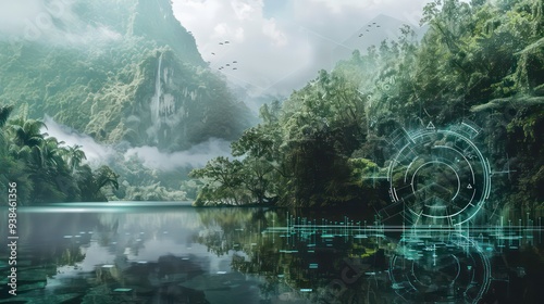 A misty jungle landscape with a lake and abstract geometric patterns.