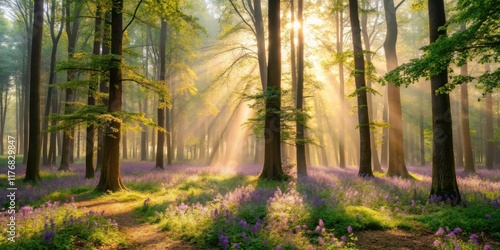 A misty morning in a forest with tall trees and wildflowers, illuminated by warm sunlight that filters through the canopy , wildflowers, misty morning