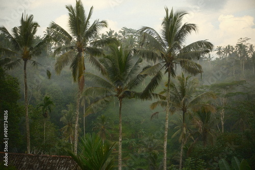 A misty morning in a tropical rainforest with tall coconut palm trees