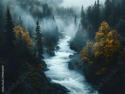 A misty river flows through a forest of vibrant autumn trees, creating a serene and tranquil atmosphere.