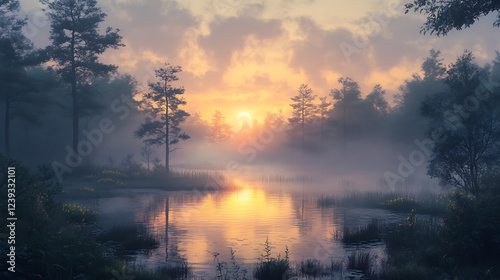 a misty sunrise over the lake with trees in the foreground