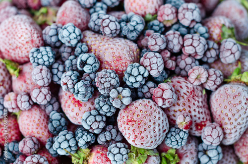 A mix of frozen berries. strawberries, blackberries, raspberries covered with hoarfrost. Close-up top view. Background.