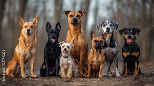 A mixed-breed dog pack standing together in an outdoor shelter area