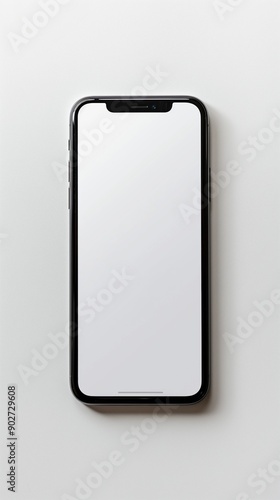 A mobile phone with white blank display screen is sitting on a white isolated surface, smartphone mockup template design