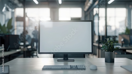 A mockup featuring a blank white screen monitor set against a backdrop of a modern office workspace.