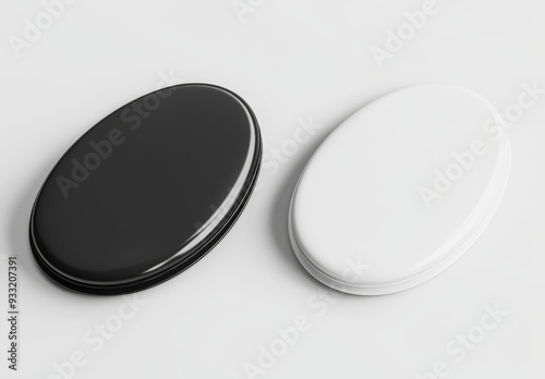A mockup of a blank black and white ellipse magnet, viewed from the side