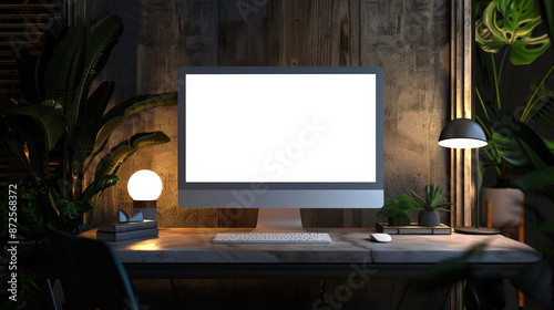 A mockup of a computer monitor. There is a computer monitor with a keyboard and mouse on a stylish table. The table is well lit, and there are several books on it