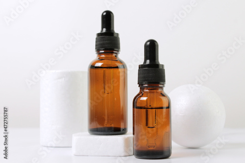 A mock-up of an empty glass dropper bottle made of brown glass stands on a white podium and a white background. Skin care serum, banner or template. The concept of a natural cosmetic product.Copyspace