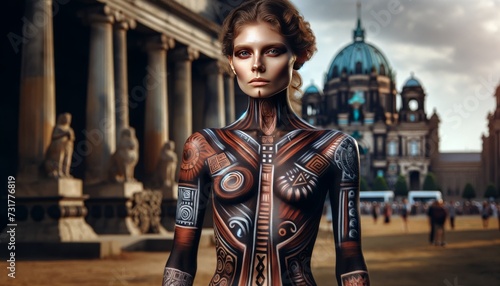 A model with body paint depicting traditional tribal patterns, standing in front of a historical landmark.