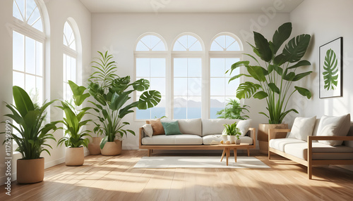 A modern 3D-rendered interior showcases lush tropical houseplants in decorative pots, bathed in natural sunlight against crisp white walls. Their shadows dance across a wooden floor.