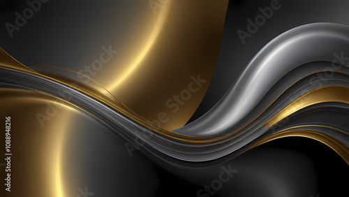 a modern abstract background with a flowing theme, using metallic hues like silver and gold, paired with dark gradients