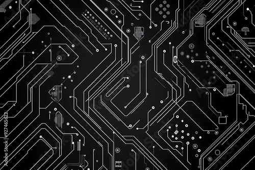 A modern abstract circuit design with silver lines and dots on a sleek dark background, ideal for technology-related templates and web design.
