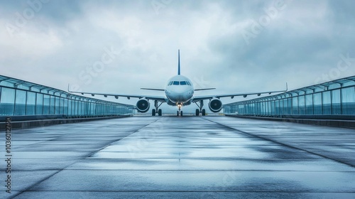 A modern aircraft waits at the terminal linked by an elegant glass bridge under a gray sky