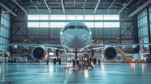 A modern airplane in a spacious hangar, showcasing advanced design and engineering, ready for maintenance and inspection.