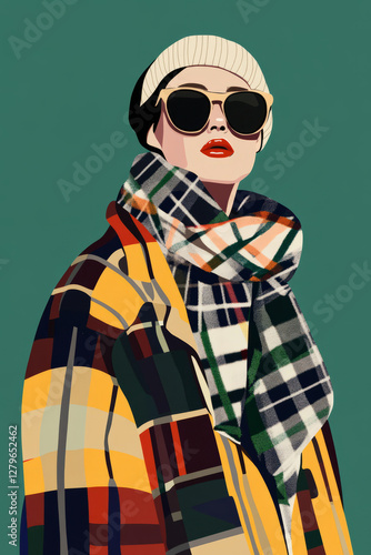 A modern and trendy illustration of a fashion forward individual wearing a plaid outfit, paired with oversized sunglasses and a stylish scarf, reflecting 2024 fashion trends.