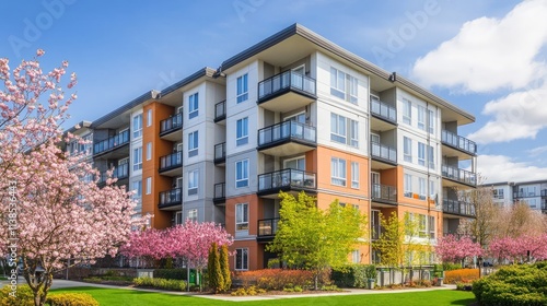 A modern apartment building with balconies, surrounded by blossoming trees under a bright blue sky. Springtime vibes!