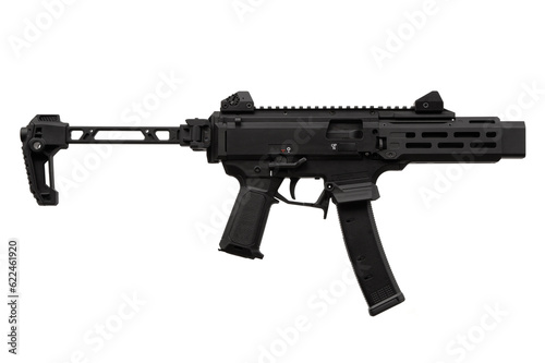 A modern automatic carbine chambered for 9mm pistol caliber. Weapons for the police, army and special units. Isolate on a white back.