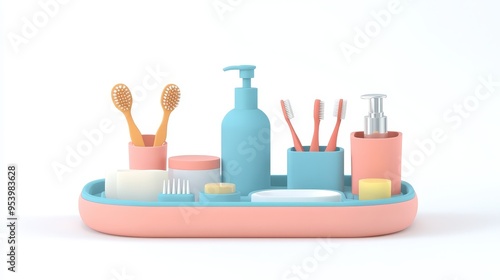 A modern bathroom organizer featuring a pastel color scheme and a cute, cartoon-like design. The organizer features compartments for various bathroom essentials such as toothbrushes, soap, and lotion.