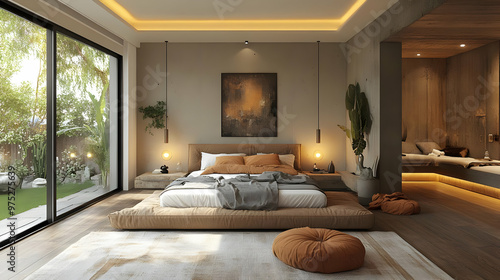 A modern bedroom with a platform bed, large windows, and a view of a garden.
