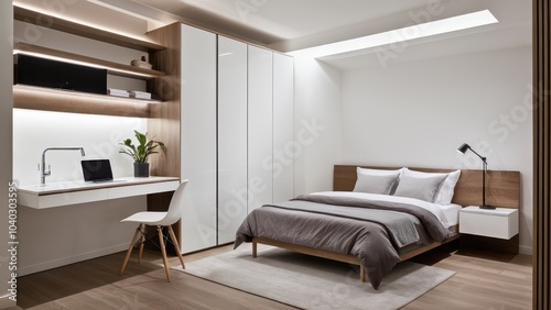 A modern bedroom with wooden elements features a cozy bed, sleek desk setup, built-in shelves, and natural light through large windows.