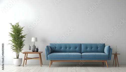 A modern blue sofa with wooden legs in a minimalist living room with a white wall and a wooden side table.