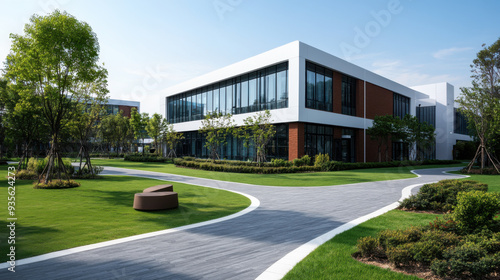 A modern building with a landscaped garden and walking paths, showcasing a harmonious blend of architecture and nature.