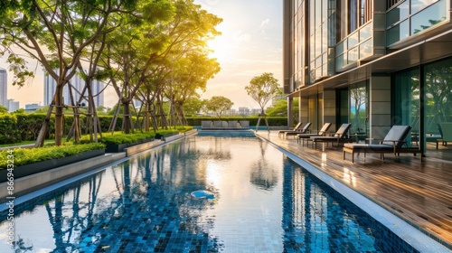 A modern building with a pristine swimming pool, surrounded by lush greenery and a wooden deck with lounge chairs