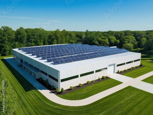 A modern building with a solar panel roof, surrounded by greenery and grass, showcasing sustainable energy in an eco-friendly environment.