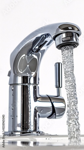 a modern chrome faucet with a steady stream of clear water flowing from it, captured against a neutral white background.