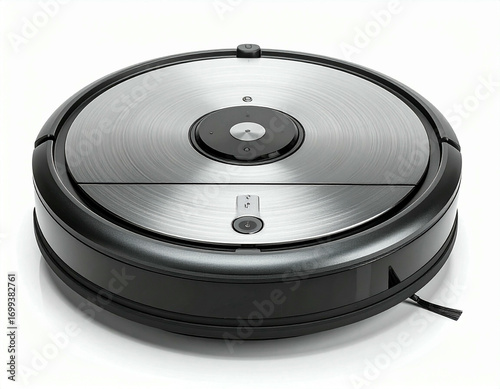 A modern, circular robot vacuum cleaner, showcasing its design and features, isolated on white.