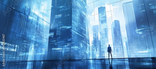 A modern city with glass skyscrapers and reflections of the sky, rendered in blue tones The background is blurred to emphasize the architecture of the buildings Generative AI