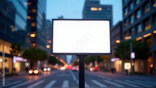 A modern citylight board mockup glowing softly against a background of blurred city lights and sleek architecture.