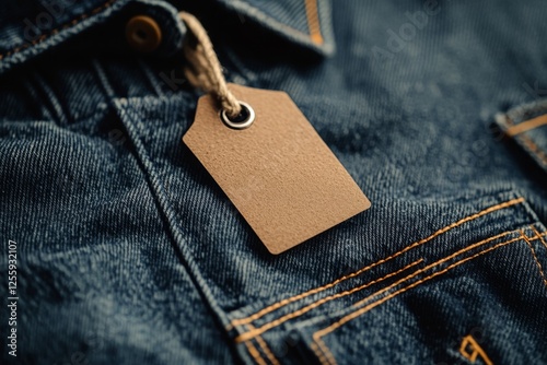 A modern clothing label tag attached to a denim jacket, highlighting its clean typography and sleek branding design