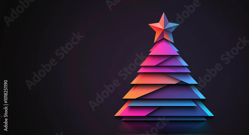 A modern, colorful Christmas tree with vibrant gradient layers, topped by a star. Set against a dark background with glowing lights. generative ai