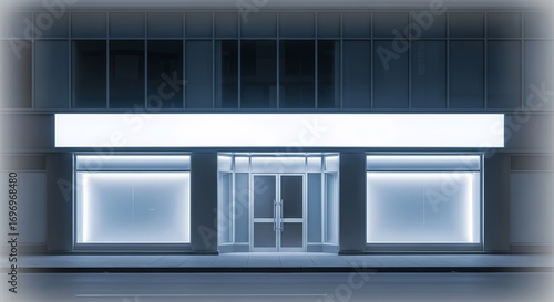 A modern commercial building exterior with illuminated signage and large glass windows, nighttime scene.