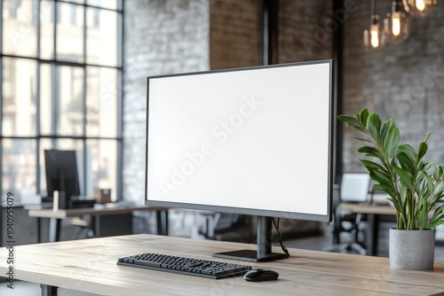 A modern computer monitor with a blank screen sits on a wooden desk in a modern office setting.