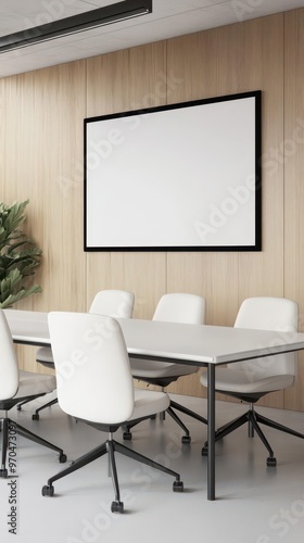 A modern conference room with a digital screen showing a virtual meeting, conference room, digital screen, virtual meeting