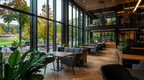 A modern co-working space with modern furniture, high ceilings and large glass windows offering stunning views