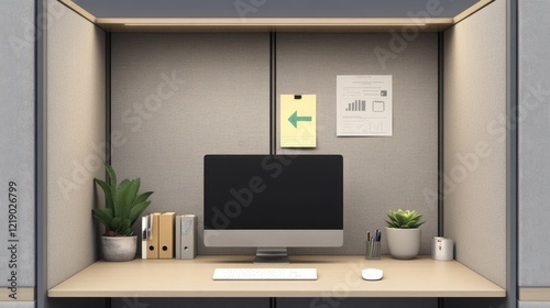 A modern cubicle setup with a desktop computer, motivational poster, and a succulent plant.