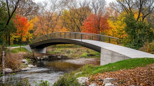 A modern, curved pedestrian bridge, crossing a small river in an urban park, surrounded by colorful autumn trees