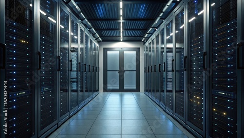 A modern data center corridor lined with server racks, illuminated by overhead lights, leading to a secure door at the end.